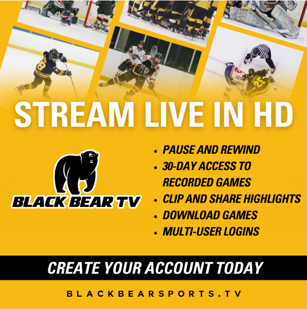 Several packages to watch and stream games will be available including yearly monthly, and single-game options. Each game will feature a high-quality HD feed, live stats integration, and a 180-degree VIPR panoramic feed of the entire ice. Black Bear TV is designed and supported for viewing on PC, MAC, Android phones and tablets, and iOS phones and tablets. Fans will also be able to watch on one of several OTT devices including Roku, Apple TV, Amazon Fire TV, and Android TV, either live or on-demand, and will feature such benefits as multiple accounts, clipping, downloading access, and a dedicated app powered by Visaic. BBSG has partnered with Visaic to create an interactive web platform and site. Starting immediately, fans can go to blackbearsports.tv to create their account and choose from one of three different types of plans, which include pricing for pay-as-you-go per game viewing with 48-hour access, a monthly plan, or a yearly plan.